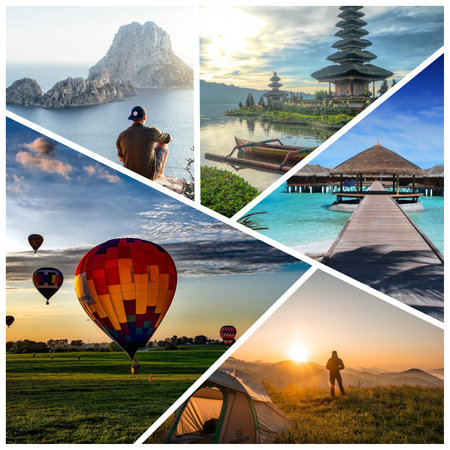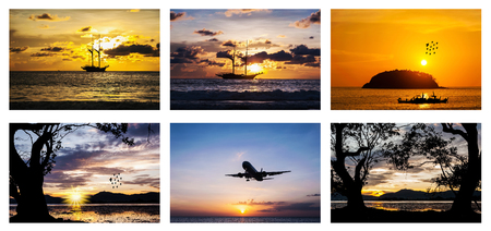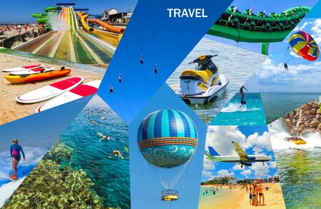 Travel concept illustrated by pictures on background of sea, islands and sky