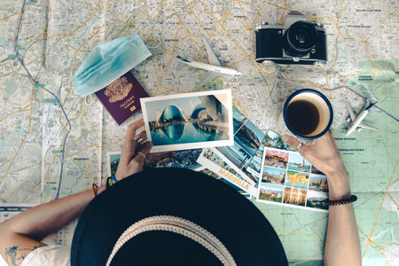 journey and release. Top view of a table in the airport lounge, passports, a cup of coffee, a camera and a map. vacation concept, airplane flight. Flatlay.