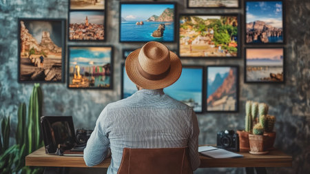 A man sitting at a desk with multiple frames displaying various travel photos, evoking wanderlus