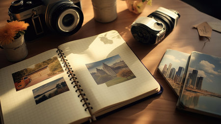 Flat lay of travel photo album with vintage typewriter on wooden table