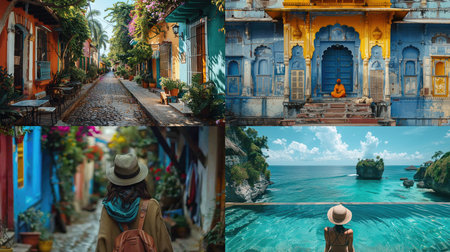 Collage of a woman with a hat and a backpack on her back in front of a colorful building on a tropical island