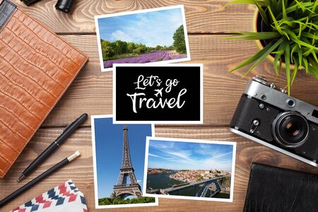Travel photos, camera and supplies on office wooden desk table. Top view with copy space