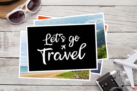 Travel concept with vacation photos, airplane toy, camera and sunglasses on wooden table. Top view flat lay with copy space