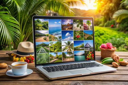 Vibrant laptop screen displaying edited travel photos surrounded by exotic tropical plants and colorful accessories on a wooden table at a scenic outdoor location.