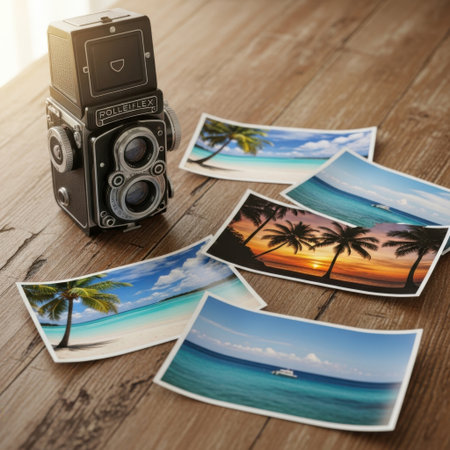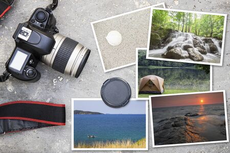 Modern digital camera is lying on beige blanket near several printed photos depicting various travel destinations