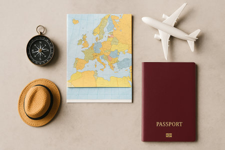Travel essentials like a passport, map, and hat are laid on a table next to a toy airplane.