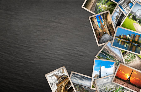 Travel photographs are scattered across a cobblestone sidewalk, capturing landmarks and scenic views during a warm evening. The soft light adds a nostalgic ambiance.