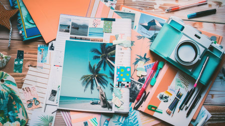 Colorful arrangement of travel memories featuring scenic landscapes, iconic landmarks, and exotic souvenirs surrounding a digital camera, capturing the essence of adventure and exploration.