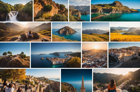 Collage of travel photos. Postcards with famous landmarks and cultural experiences from around the world. Concept wanderlust and adventure