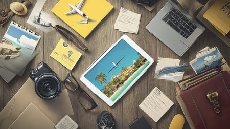 A vibrant scene featuring a tablet displaying a tropical island resort, surrounded by travel essentials and planning materials, capturing the essence of vacation inspiration and adventure.