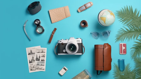 This flat lay image features a collection of travel essentials and photography gear, showcasing a camera, map, compass, and other creative tools, perfect for adventurers.