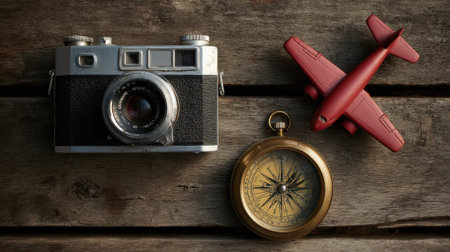 A flat lay composition featuring a vintage camera, a brass compass, and a red toy airplane on a rustic wooden surface, evoking a sense of adventure and travel.