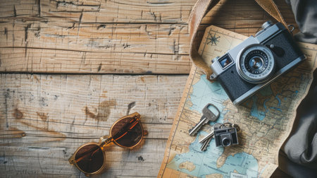 A flat lay composition featuring travel essentials like a vintage camera, binoculars, sunglasses, and miniature airplane and sailboat.