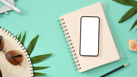 Summer workspace background concept, Smartphone white screen mockup, notebook, beach hat, sunglasses, palm leaf and accessories on green background. top view
