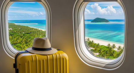 A vibrant suitcase frames a stunning tropical landscape with a distant airplane flying over a serene beach, evoking travel and adventure. Perfect for getaway dreams.