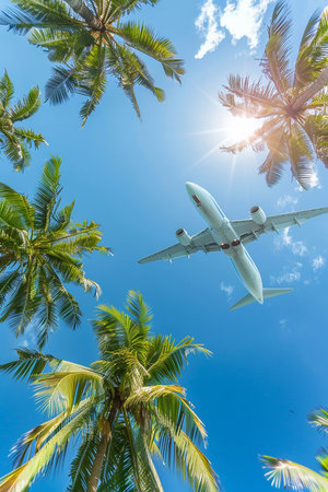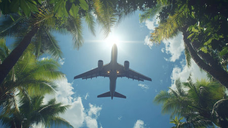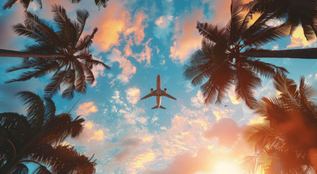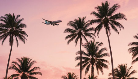 Plane soaring above palm tree-lined horizon during summer season