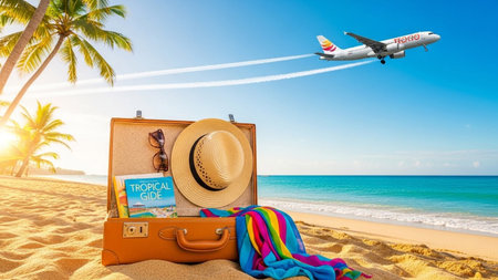 An open vintage suitcase sits on a golden sandy beach, filled with essentials for a tropical vacation. A straw hat, sunglasses, a travel guidebook titled Tropical Guide, and a colorful striped towel spill out. In the background, palm trees sway under a bright blue sky, and the turquoise ocean meets the horizon. An airplane soars overhead, leaving white contrails in its wake, symbolizing the journey and adventure of travel.