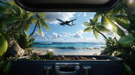 An open suitcase reveals a stunning tropical beach scene featuring palm trees, clear skies, and an airplane soaring above the tranquil ocean. Perfect for travel enthusiasts.