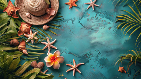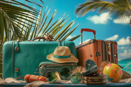 Stacked turquoise suitcases adorned with flowers and a straw hat against a backdrop of palm trees and azure skies, capturing the essence of travel and leisure