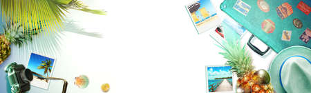 Traveler accessories on white background with empty space for text. Travel vacation concept. Summer background. Road frame set. Flat lay, top view