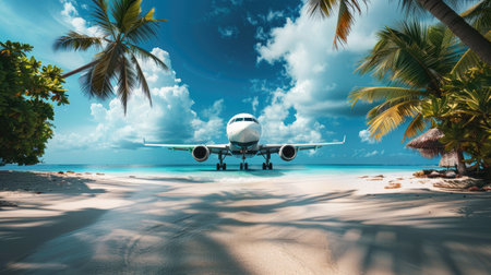 Aerial view of an airplane landing on a tropical beach with palm trees and turquoise water for travel magazine cover
