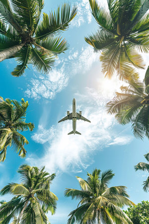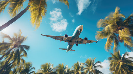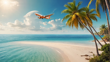 A blue sky with coconut trees and airplane heading towards a tropical sea beach, for travel blogs, holiday advertisements, and social media content promoting tourism, beach getaways.