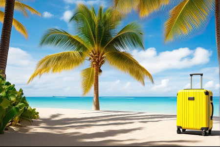 A yellow suitcase on a tropical beach is a trip to the sea in a warm summer climate, a vacation tour. Copy space, mock up, AI generated