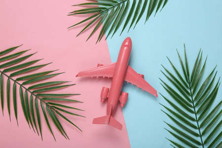 Air plane and palm green leaves on pink blue background. travel concept. tropical composition. top view. flat lay