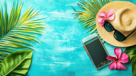 Enjoy a vibrant tropical flat lay featuring sunglasses, a straw hat, and a smartphone against a bright blue background with green leaves and pink flowers. Perfect for summer themes.