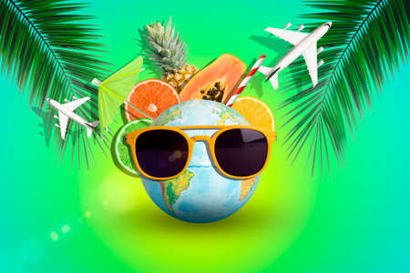 Summer fruits and travel vacation background. Tropical juicy fruits, pineapple, citrus and palm branches with earth globe in sunglasses on colored background. Travel, summer, creative idea concept.