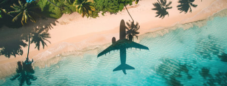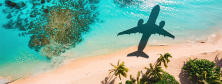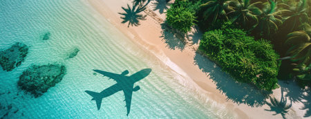 Traveling adventure airplanes shadow casts on sandy beach with crystal turquoise water background coastal dream destination summer vacation getaway sunlight sky shadow reflection beach sand