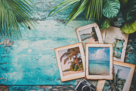 Set for summer vacation, camera with photos, Generative AI content
