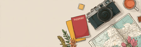 Flatlay composition showcases essential travel items such as a passport, map, camera, and coffee, perfect for planning your journey.