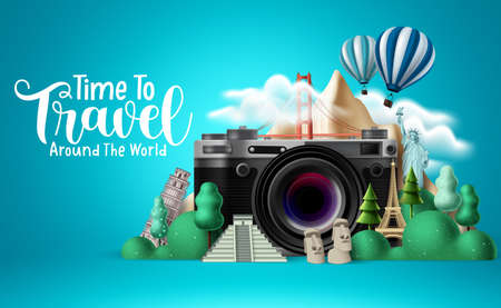 Travel time vector design. Time to travel around the world text with traveler camera elements and international landmarks for trip and tour vacation. Vector illustration
