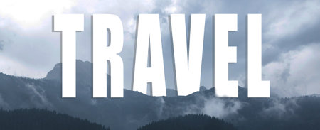 Travel concept, banner photo with heading text and beautiful moody mountains photo