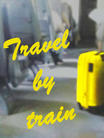 The inscription TRAVEL BY TRAIN on the background of the interior of the train car with a yellow suitcase