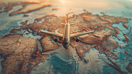 A small airplane is flying over a map of the world. The airplane is positioned in the middle of the map, with the wings extending out to the right and left. Concept of adventure and exploration