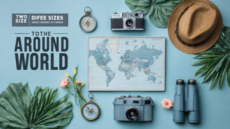 A collection of travel essentials including a vintage camera, world map, compass, binoculars, and hat, arranged on a light blue background.