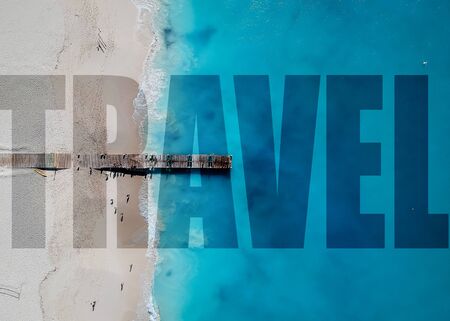 Word TRAVEL made of photo with sea shore, isolated on white background