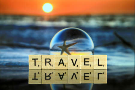 WROCLAW, POLAND - FEBRUARY 28, 2020: The word TRAVEL made of scrabble letters, sunset and view of a starfish through a glass, crystal ball (lensball) for refraction photography in the background.