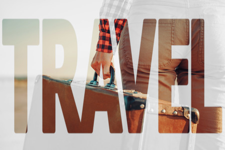 Double exposure word travel combined with image of traveler woman holding a suitcase outdoor. Concept of travel