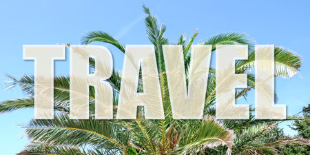 Green palm at tropical resort on sunny day and word TRAVEL