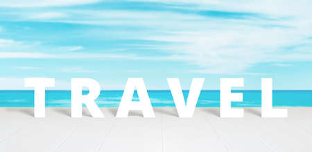 Travel text on white wooden surface front of blue sea and sky