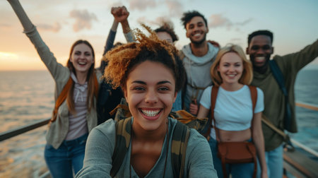 Diverse group of friends enjoying a sunset by the beach, smiling and posing for a selfie, capturing the essence of friendship and happiness in a beautiful outdoor environment