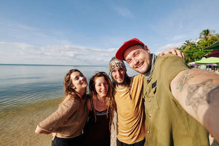 A group of happy young people are smiling and taking a selfie by the water on the beach under a cloudy sky
