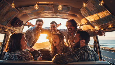 A group of friends enjoys a road trip adventure. They are seen inside a van, illuminated by warm sunlight. The image showcases natural skin tones and a sense of freedom. This could be used for travel, lifestyle, or social media content.