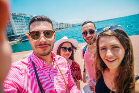 Group of happy friends taking selfies together in urban. Friends group enjoy trip holiday having fun.