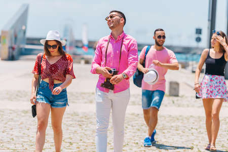 Group of friends having fun talking together while traveling in urban.