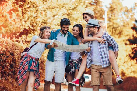 Happy friends looking at a map together on a sunny day. Travel, adventure, and friendship concept