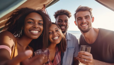 Enjoying summer with friends Group of young happy people having fun together while sitting on beach near their minivan : Generative AI